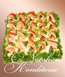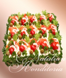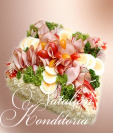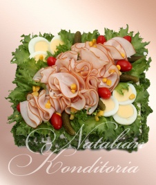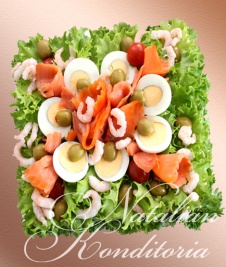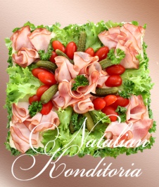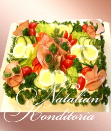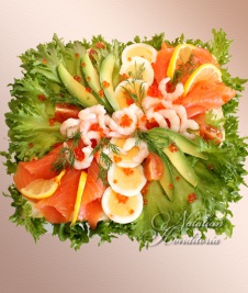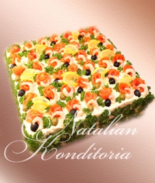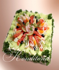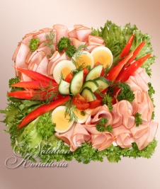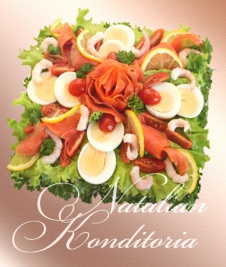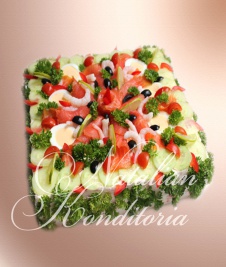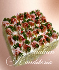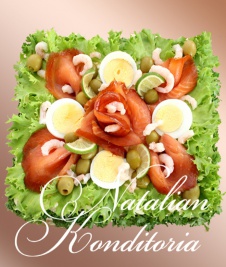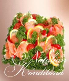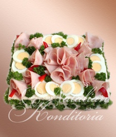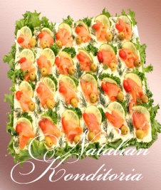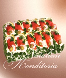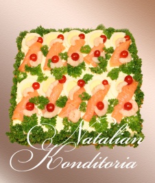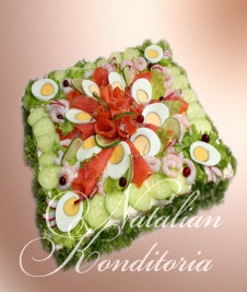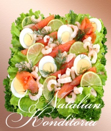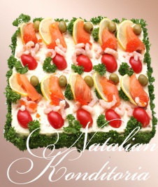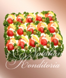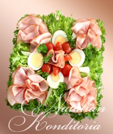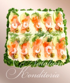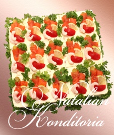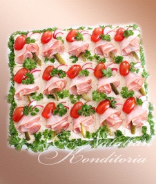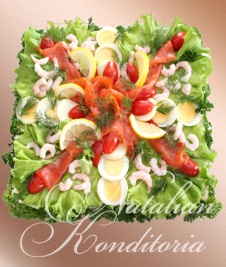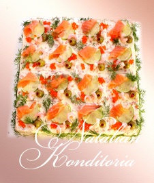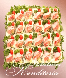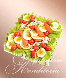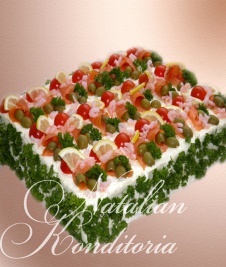 Decorated with slices of smoked salmon, gravlax, tuna fish or ham, herbs and vegetables